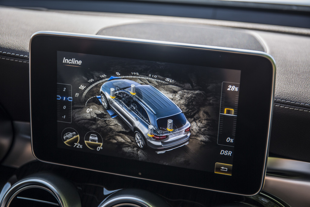 Doch das komfortable Fahrwerk hat natürlich auch andere Vorteile, erlaubt es doch die Höhenverstellung des Fahrwerks für Fahrten ins Gelände. Um 5 Zentimeter lässt sich die Karosse zunächst einmal anheben, wenn der Untergrund rauer wird, doch das ist beileibe nicht alles. Mit dem Offroad-Paket bekommt der Fahrer ein extrem leistungsfähiges Tool für unwegsame Untergründe aller Art. Der GLC meistert dann Verschränkungen, dass es eine wahre Freude ist, in den Löchern auf dem Testparcours hätte man großformatige Reisekoffer verstauen können, der kleine Daimler fürs Grobe stolziert unter Einsatz von Elektronik und eben des Fahrwerks souverän über solche Hindernisse hinweg. Gleich 5 Geländeprogramm für unterschiedliche Situationen stehen parat. Das reicht vom Glätteprogramm über spezielle Einstellungen für extreme Steigungen bis hin zu einem speziellen Modus zum Freischaukeln, falls man sich festgefahren hat. Ein Programm für den Anhängerbetrieb gibt es ebenfalls, da kommt es wie gerufen, dass die extra zu bestellende Hängerkupplung auf Tastendruck an der Heckklappe motorisch unter dem Fahrzeugboden herausfährt. Den Hängerbetrieb haben wir nicht ausprobiert, aber was der GLC an Steigungen meistert, ist schlichtweg atemberaubend. Das Gleiche gilt für Fahrten durch richtig grobschlächtiges Gelände. Beeindruckend. Punkt.